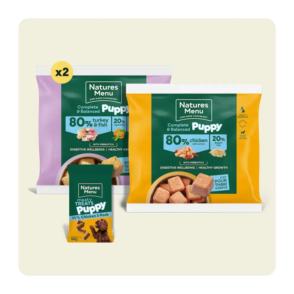 They'll get to try our most popular raw puppy meals – made with 80% real meat, healthy brown rice, fruits and vegetables – plus puppy-friendly treats for positive training sessions. Each recipe is approved by vets and free from artificial colourings and preservatives. Choose from 3 box sizes. The bigger the box, the longer it lasts – and the more variety your puppy can explore as they grow.