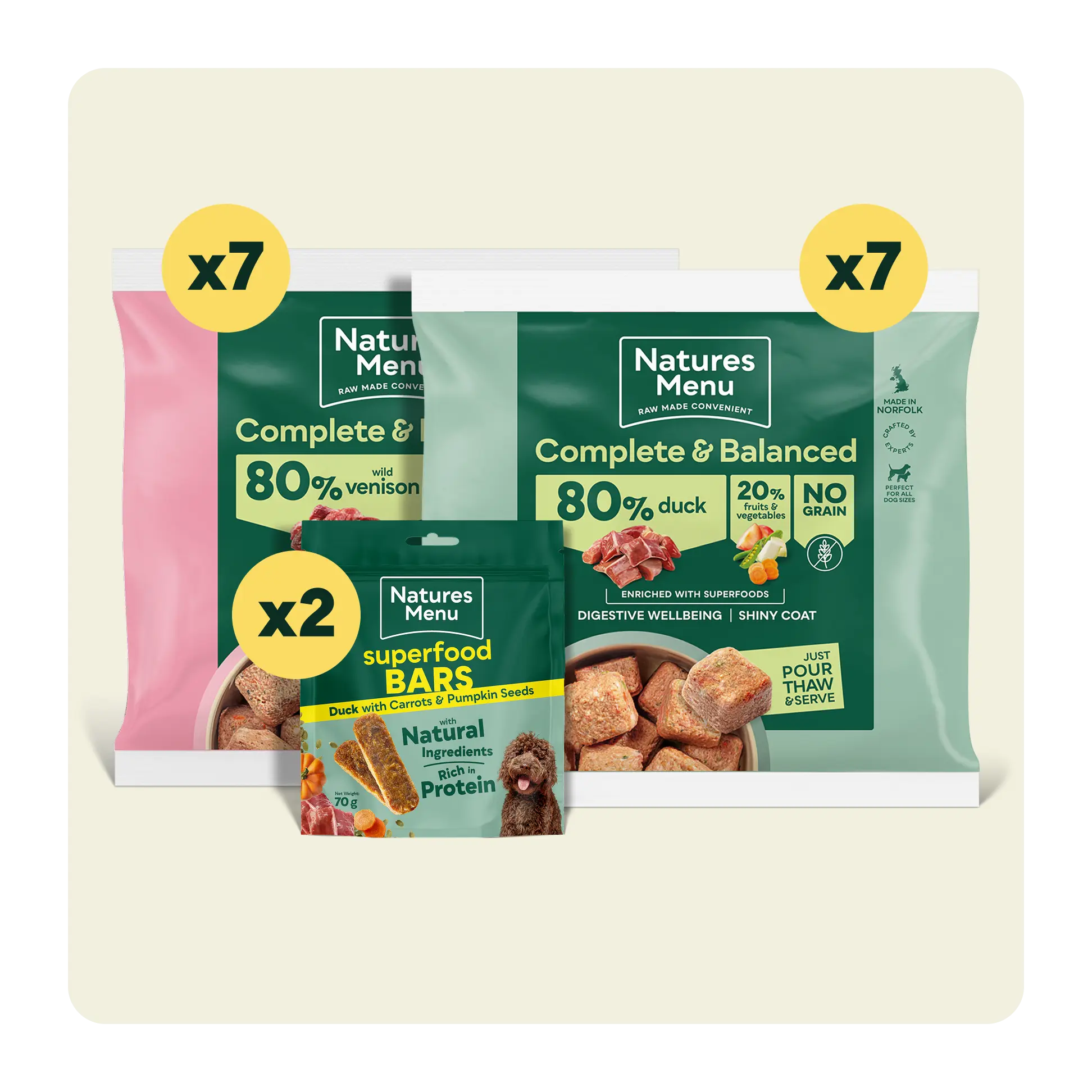 7 x Raw Block 80% Wild Venison (500g) 7 x Raw Block 80% Duck (500g) 2 x Duck Superfood Bars (50g)